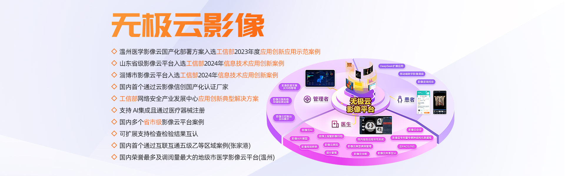 擁有多家年門診量400多萬以上人次的大型三甲醫(yī)院全院PACS及云影像案例,多個省市規(guī)模醫(yī)學(xué)影像云平臺案例,承建的溫州市醫(yī)學(xué)影像云平臺榮獲浙江省最多跑一次改革十佳案例、省領(lǐng)跑者定位題詞、全國惠民便民優(yōu)秀案例、基于影像云AI分析試點(diǎn)單位等榮譽(yù)。